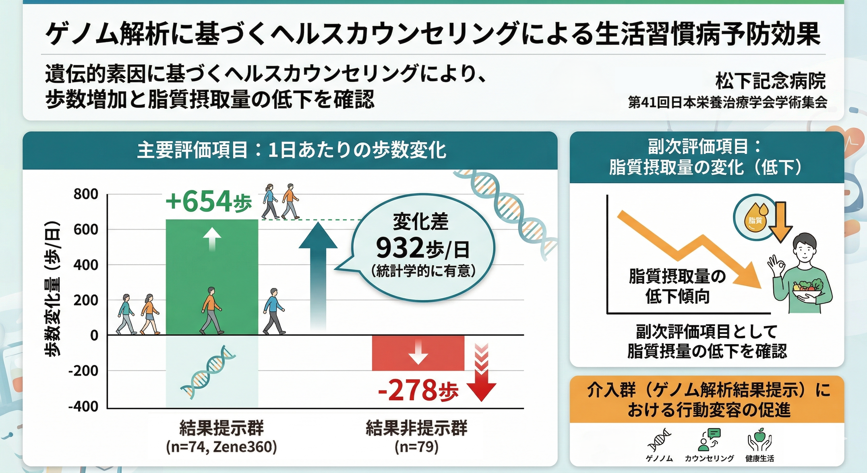 ― 遺伝的素因に基づくヘルスカウンセリングにより、歩数増加と脂質摂取量の低下を確認 ―